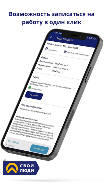 Работа грузчиком в Москве и МО, Svoi Lyudi tarafından geliştirilen bir Android uygulamasıdır. Bu uygulama, Moskova ve çevresinde doğrudan işverenlerden iş ve yarı zamanlı iş fırsatları sunar. Kullanıcılar, kaydolduktan sonra, mevcut iş taleplerine anında erişim sağlayarak, yalnızca bir tıkla iş bulabilir ve kaydolabilirler. Uygulama, taşımacılardan, işçilere, ustalardan, depo personeline kadar geniş bir iş yelpazesi sunar.